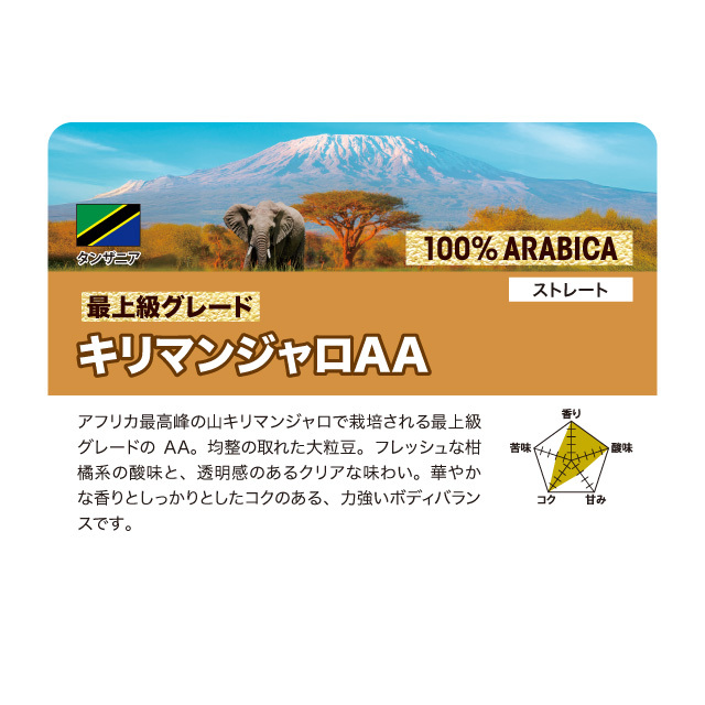 アフリカ最高峰の山キリマンジャロで栽培される最上級グレードのAA。均整の取れた大粒豆。フレッシュな柑橘系の酸味と、透明感のあるクリアな味わい。華やかな香りとしっかりとしたコクのある、力強いボディバランスです。
