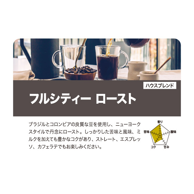ブラジルとコロンビアの良質な豆を使用し、ニューヨークスタイルで丹念にロースト。しっかりした苦味と風味、ミルクを加えても豊かなコクがあり、ストレート、エスプレッソ、カフェラテでもお楽しみください。
