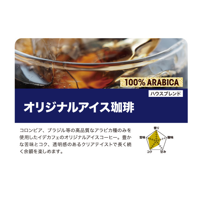 TOP全商品一覧 コーヒー 家庭用 Gourmand's Coffee イデカフェオリジナル オリジナルアイスコーヒー 価格: ¥1,812 (税込 ¥1,957) ~ ¥3,020 (税込 ¥3,262) 販売期間: 数量: 個 重量状態価格在庫購入200g豆¥1,812(税込 ¥1,957)○ 粉¥1,812(税込 ¥1,957)○ 400g豆¥3,020(税込 ¥3,262)○ 粉¥3,020(税込 ¥3,262)○ 重量状態価格在庫購入200g豆¥1,812(税込 ¥1,957)○ 粉¥1,812(税込 ¥1,957)○ 400g豆¥3,020(税込 ¥3,262)○ 粉¥3,020(税込 ¥3,262)○ 返品についての詳細はこちら コロンビア、ブラジル等の高品質なアラビカ種のみを使用したイデカフェのオリジナルアイスコーヒー。豊かな苦味とコク、透明感のあるクリアテイストで長く続く余韻を楽しめます。 香り 苦味 コク 甘味 酸味 5 5 4 2 1