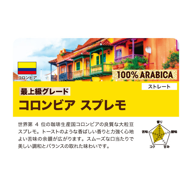 TOP全商品一覧 コーヒー 家庭用 Gourmand's Coffee ストレート コロンビアスプレモ 価格: ¥1,909 (税込 ¥2,062) ~ ¥3,181 (税込 ¥3,435) 販売期間: 数量: 個 重量状態価格在庫購入200g豆¥1,909(税込 ¥2,062)○ 粉¥1,909(税込 ¥2,062)○ 400g豆¥3,181(税込 ¥3,435)○ 粉¥3,181(税込 ¥3,435)○ 重量状態価格在庫購入200g豆¥1,909(税込 ¥2,062)○ 粉¥1,909(税込 ¥2,062)○ 400g豆¥3,181(税込 ¥3,435)○ 粉¥3,181(税込 ¥3,435)○ 返品についての詳細はこちら 世界第4位の珈琲生産国コロンビアの良質な大粒豆スプレモ。トーストのような香ばしい香りと力強く心地よい苦味の余韻が広がります。スムーズな口当たりで美しい調和とバランスの取れた味わいです。 香り 苦味 コク 甘味 酸味 4 3.5 4 2 2.5