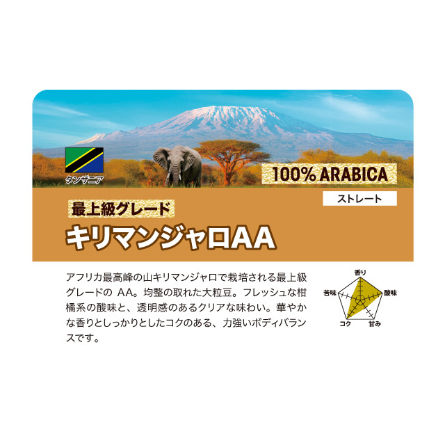 アフリカ最高峰の山キリマンジャロで栽培される最上級グレードのAA。均整の取れた大粒豆。フレッシュな柑橘系の酸味と、透明感のあるクリアな味わい。華やかな香りとしっかりとしたコクのある、力強いボディバランスです。