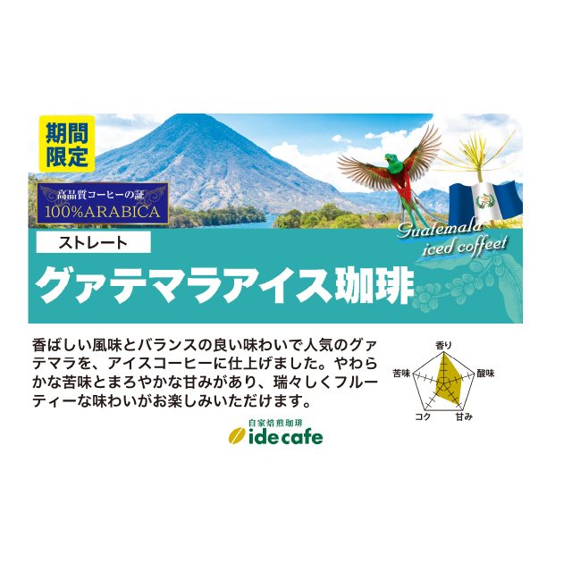 TOP全商品一覧 コーヒー 家庭用 スペシャリティコーヒー ハウスブレンド 【夏季限定】グァテマラアイスコーヒー 価格: ¥1,716 (税込 ¥1,853) ~ ¥2,860 (税込 ¥3,089) 販売期間: 2026年04月15日00時00分~2028年09月29日23時59分 数量: 個 重量状態価格在庫購入200g豆¥1,716(税込 ¥1,853)○ 粉¥1,716(税込 ¥1,853)○ 400g豆¥2,860(税込 ¥3,089)○ 粉¥2,860(税込 ¥3,089)○ 重量状態価格在庫購入200g豆¥1,716(税込 ¥1,853)○ 粉¥1,716(税込 ¥1,853)○ 400g豆¥2,860(税込 ¥3,089)○ 粉¥2,860(税込 ¥3,089)○ 返品についての詳細はこちら 香ばしい風味とバランスの良い味わいで人気のグァテマラを、アイスコーヒーに仕上げました。 柔らかな苦味とまろやかな甘みがあり、瑞々しくフルーティーな味わいがお楽しみいただけます。 香り 苦味 コク 甘味 酸味 5 1 2 4 3 他にもこんな商品があります 【夏季限定】ブラジルピーベリーアイスコーヒー ¥1,548(税込 ¥1,672) ~ 【夏期限定】オリジナルアイスコーヒー ¥1,812(税込 ¥1,957) ~ 【夏季限定】モカアイスコーヒー ¥1,896(税込 ¥2,048) ~